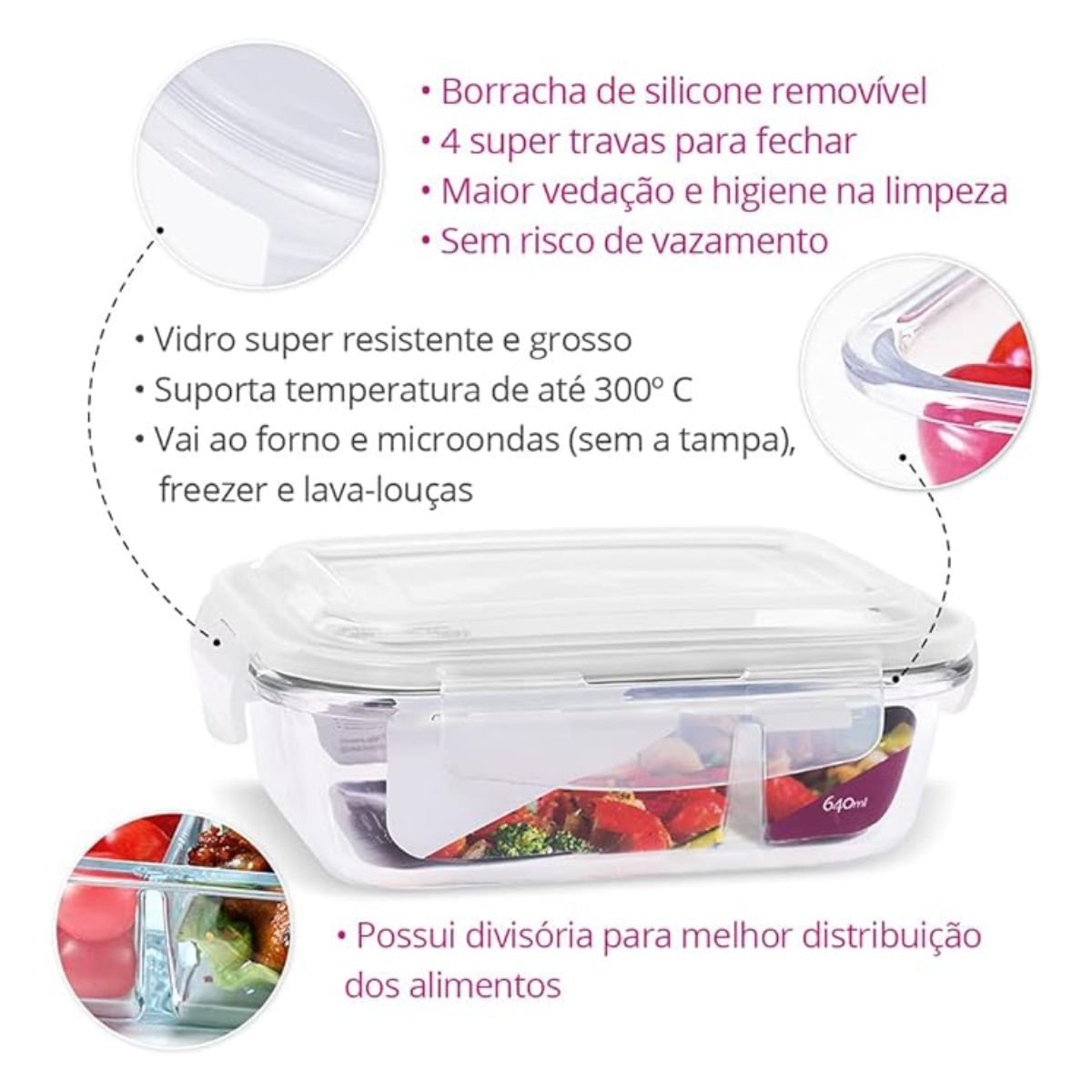 • Marmitas Diárias: Simplifique o preparo da semana e tenha refeições prontas com a vedação que preserva o sabor.